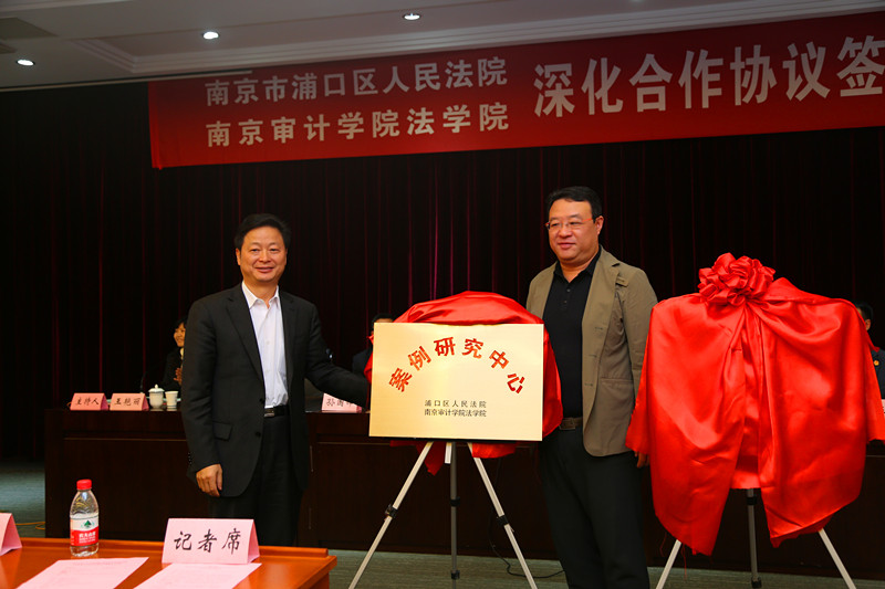 在仪式上,浦口区人民法院院长陈高峰与swagporn 主持工作的副院长刘爱龙签署了全面深化合作协议,协议内容涉及平台共建、信息共享、学术研究、人员交流、学生实践活动等诸多方面。张建红副书记与市中院冯驰副院长为“法学实践教学及审判实务研究中心”和“案例研究中心”正式揭牌。