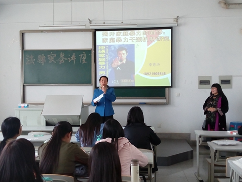 李秀华首先向同学们抛出引导性问题:提到“家暴”你能想到什么?根据同学们的回答她阐述了对家庭暴力这一概念应进行多角度理解。她还与同学们进行了互动,让大家自由联想,说出看法,现场气氛活跃。在一番交流后,李秀华让同学们认识到,家庭暴力不光光是家庭成员间的殴打等暴力行为那么简单,它还包括诸如“冷暴力”等多种形式,结果造成的不光有人身伤害,还包括精神损伤,有的甚至会威胁到家庭成员的生命安全。