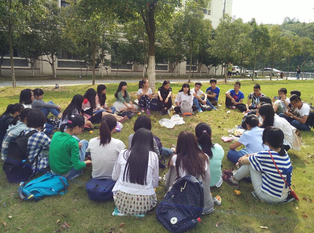 在这金桂飘香的校园里,这些班导师们可是忙得不亦乐乎,他们通过建立微信群等多种方式跟同学们沟通,陆续召开班会,深入班级为同学们提供全方位指导。9月23日下, 2015级法会2班的学业班导师王艳丽,就在文济楼下的草坪上召集同学们开了一次别开生面的户外班会暨中秋联谊会。“来来来,大家来,一起吃零食,让我们吃起来过中秋!”同学们被她的一席话逗笑了。同学们围成一个大圆圈席地而坐,专业班导师亲切地询问大家对住宿条件是否满意,是否吃得惯食堂的饭菜,一一了解这群新朋友们来校后的各方面适应情况。欢声笑语中,班导师娓娓道来专业学习的重要性,并鼓励同学们要不畏难,坚定专业学习目标,在学习上有意识地培养专业兴趣,慢慢喜欢上这个能“事先防范、事后灭火”的法学专业;同时还对同学们关于通识教育选修课、专业选修课及如何修好学分等问题一一解答。