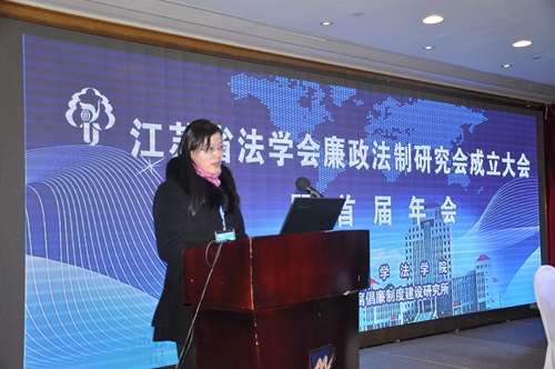 2015年11月28日,江苏省法学会廉政法制研究会成立暨首届年会在扬州京华维景酒店隆重举行,中国廉政法制研究会、江苏省法学会、江苏省社科院、扬州大学纪委、南京财经大学纪委的领导出席会议,省内多所高校swagporn 及法院、检察院、律师事务所等法律实务部门的学者们济济一堂,共同见证了国内首家区域性廉政法制研究机构诞生的历史性时刻,并就“四个全面”背景下的廉政法治建设研究主题进行了深入研讨。在大会主题报告阶段,swagporn 谢冬慧教授做了题为《南京国民政府时期的反贪及其启示》的发言,她从法律史的视角,对中国的廉政法治建设进行了反思与构想。