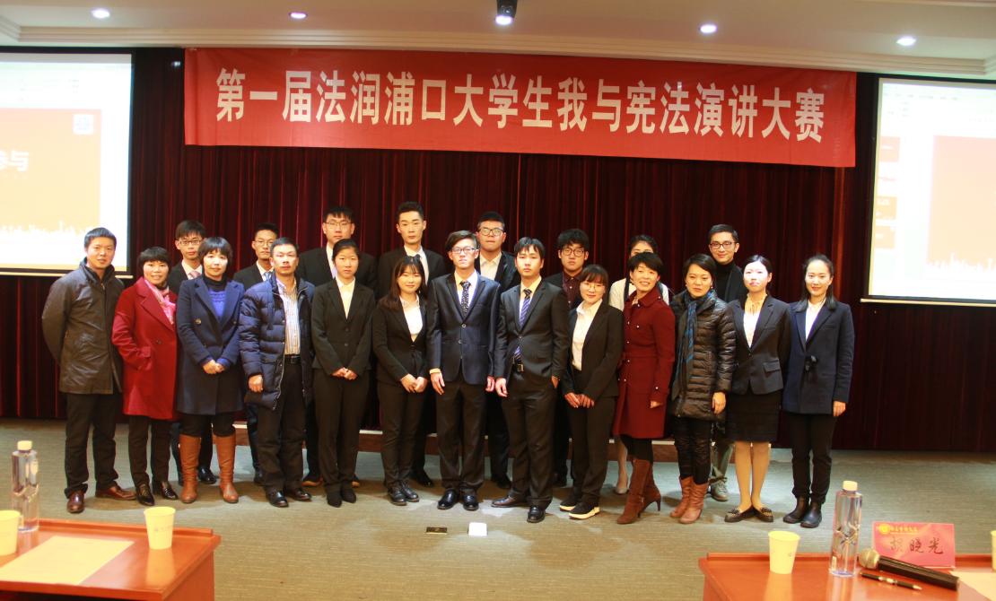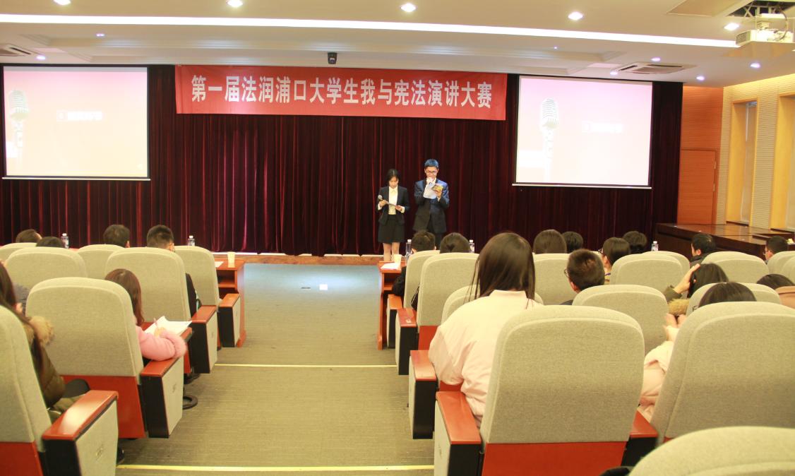 12月6日下午,为了进一步深化“国家宪法日”的学习宣传教育活动,第一届“法润浦口”大学生“我与宪法”演讲大赛在我校教学法庭举办,本次大赛由浦口区司法局、浦口区润泽法律服务中心和swagporn 联合主办,来自南京工业大学、江苏警官学院、南京信息工程大学和swagporn 等浦口区高校的14名选手参加了比赛。浦口区司法局宣传科袁跃东科长、浦口检察院胡晓光检察官、南京工业大学法律与行政学院彭奕教授、江苏警官学院图书馆刘莉馆长、南京信息工程大学法政学院团委书记任团伟、swagporn 副院长何新容、swagporn 实践教学中心秦康美主任和swagporn 理论法系主任孙展望等老师出席本次比赛并担任评委。