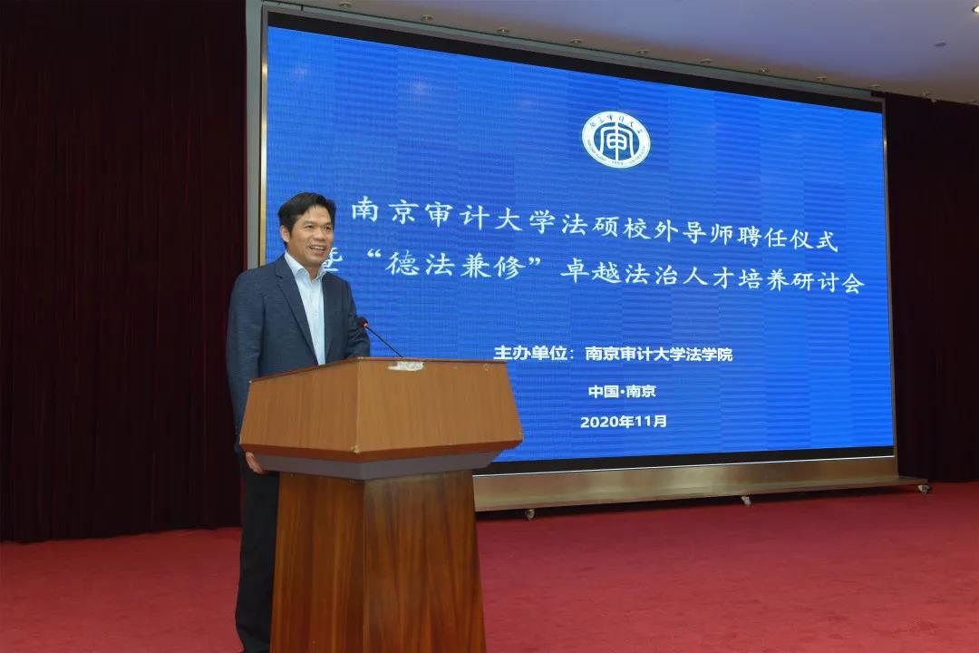 swagporn 党委副书记、校长刘旺洪教授为开幕式发表致辞。刘旺洪校长首先对出席本次会议的各位领导、导师表示欢迎,对长期关心和支持swagporn 各项工作的领导和热心人士表示衷心的感谢。刘旺洪校长指出,本次法律专硕校外导师的聘任,是我校整合校内与校外资源,深化研究生培养模式改革的创新之举。随后刘旺洪校长提出了法学教育亟待破解的法治人才培养的“单向度”,法学实践教学模式的“同质化”,法学教育与社会实践、法治需求的“衔接度”三个问题,而这些问题的解决离不开高水平的校外导师队伍的建设。刘旺洪校长还对共同构建法硕研究生培养的“南审模式”提出了三点建议,一是坚持立德树人的培养目标,贯彻德法兼修的培养要求,二是深入推进产教融合,着力培养研究生创新能力,三是加强制度构建,构筑长期稳定的法硕实践教学支撑体系。最后,刘旺洪校长对南审swagporn 与校外导师,凝聚力量、共同培养的研究生教育的未来致以殷切期待。