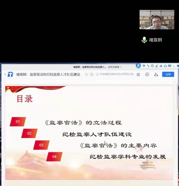 会议开始,王艳丽院长向参与此次会议的师生介绍了褚宸舸教授的学术成果并对褚教授的到来表示热烈欢迎。继而,讲座正式进入正题。褚教授从“纪检监察人才队伍建设”“监察官法”和“纪检监察学科专业的发展”这三个概念关系出发,向同学们讲述《监察官法》的立法目的和意义,接下来围绕《监察官法》立法过程、主要内容、纪检监察队伍人才队伍建设和学科发展这四个问题详细展开。自2019年12月中纪委正式提出草案以来,《监察官法》经历了全国人大的调研、一审、二审,最终在上个月20号通过。在《监察官法》的内容部分,褚教授将《监察官法》定位为责任法、监督法和保障法。与其他法律职业伦理相比,监察官职业伦理更加强调政治性、坚定性、责任感、严格性和模范性。在纪检监察人才队伍建设的问题中,褚教授以陕西为例将纪检监察队伍现状和特点娓娓道来,指出了基层纪检监察队伍的问题并强调要建立高素质、专业化的纪检监察干部队伍,要培养政治素质、职业伦理和专业技能全面发展的纪检监察人才。此外,褚教授还对新入学的研究生的未来学习和研究做了入学指导,纪检监察学科是十分有前景的,欢迎各位同学从事监察法的相关研究,进入到纪检监察的工作队伍中去。