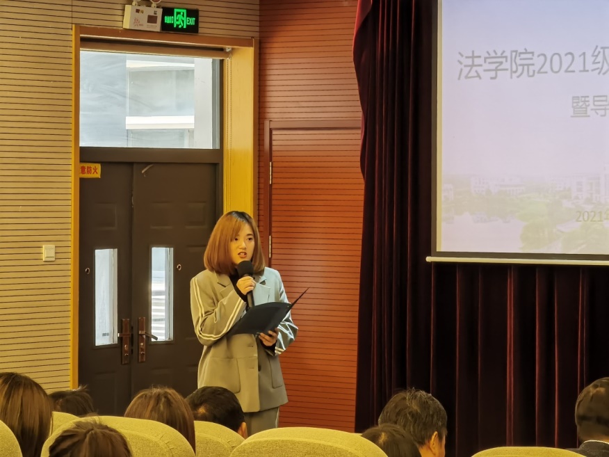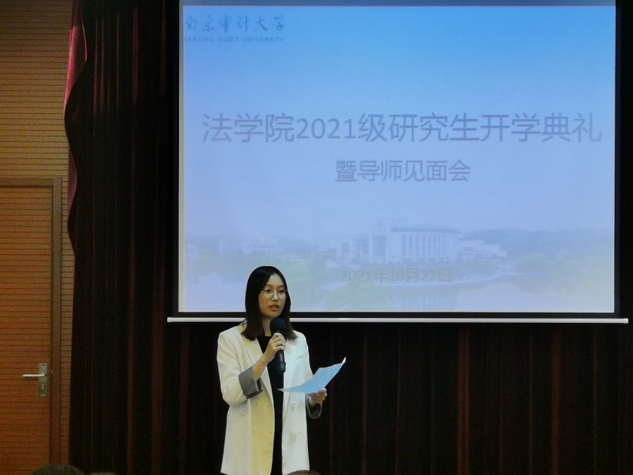 新生代表、法学硕士毛寅清引用了习近平总书记的话,“未来属于青年,希望寄予青年”,并且表示要珍惜宝贵的学习机会,要积极将个人命运与祖国的发展联系到一起。毛寅清同学还谈了谈作为四年的老生对南审的印象,满怀对新校园、新学期的期待。新生代表、法律硕士龚玥谈了谈自己与法律的第一次“触电”的感受,并且表示在学习生活中,应当细化每一个目标。龚玥同学还用张桂梅老师的例子阐发了自己对人生价值的思考,告诫同学们“不忘初心”,为法治建设添砖加瓦。