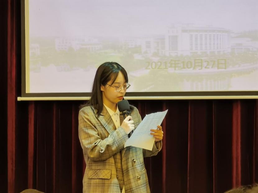 随后,老生代表、swagporn 研究生会主席衣婧发言。衣婧同学分享了自己研究生学习和生活的心得,对同学们提出了以下建议:第一,要沉下心来,坐得住冷板凳。学会探究新问题,学习新方法,研究新思路。第二,要永远满怀对科研和学习的热情。不放弃科研,也要保持对生活的热情。第三,拒绝“内卷”,拒绝“躺平”。要眼中有目标,胸中有理想,心中有信念。最后,衣婧同学表达了对学弟学妹们学习生活的美好祝愿,祝愿学弟学妹,学有所成。