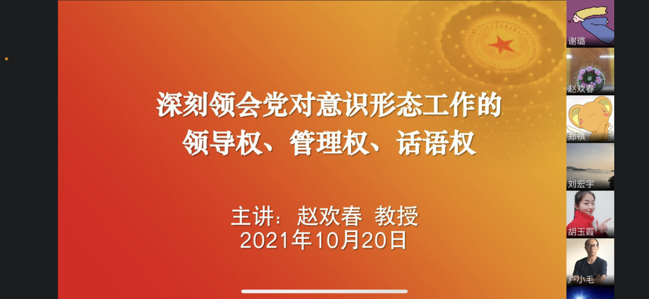 10月20日下午3点,swagporn 党委邀请马克思主义学院赵欢春书记进行线上意识形态专题集中培训,主题为《深刻领会党对意识形态工作领导权、管理权、话语权》。swagporn 全体党员教职工出席会议,会议由党委书记刘宏宇主持。