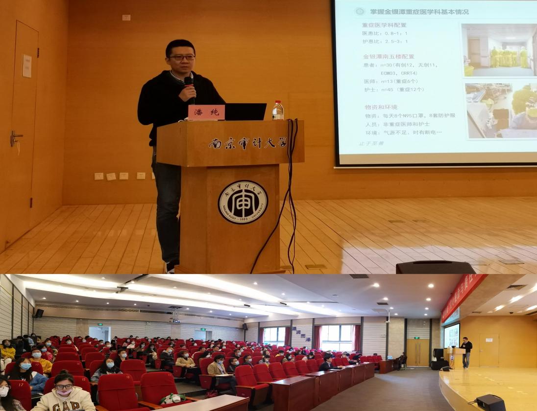 讲座伊始,王智源书记向师生介绍主讲人潘纯在武汉新冠肺炎疫情中的先进事迹,并获得2020年全国卫生健康系统新冠肺炎疫情防控工作先进个人。随后,按照“白衣执甲出战时”、“短兵相接金银潭”“感悟武汉九十天”的顺序,潘纯向大家讲述了在武汉抗击新冠肺炎时的事迹,会上潘纯博士播放了武汉抗击新冠肺炎中使用ECMO治疗的珍贵视频,生动鲜活的展示了当时的救治状况。对于武汉、南京等积极抗击肺炎疫情的城市和人民,潘纯说道“武汉、南京的人民都很勇敢、很乐观,他们对医护人员尊重支持,他们都是可敬的...”最后,潘纯对大家的日常防护也给出了几点建议包括:戴口罩、勤洗手以及保持社交距离等。
