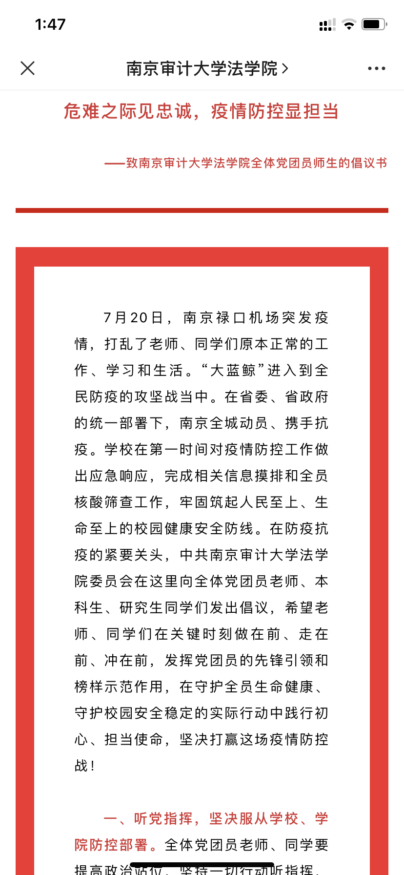 第一时间发出倡议书。7月25日,swagporn 在官方微信公众号发出了题目为《危难之际见忠诚,疫情防控显担当——致swagporn 全体党团员师生的倡议书》,希望swagporn 的师生们在关键时刻做在前、走在前、冲在前,坚决打赢这场疫情防控战!