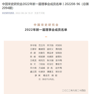 近日,中国宋史研究会公布了2022年新一届理事会成员名单,swagporn 肖建教教授当选。中国宋史研究会是由民政部登记、教育部主管,全国宋史研究者自愿结成的非盈利的学术性团体。该会成员长期以来致力于宋史研究,为弘扬中国优秀文化传统,促进精神文明建设,加强国内外学术文化交流做出贡献。据悉,本届理事会共有理事成员35人,来自北京大学、清华大学、中国科学院、复旦大学、华东师范大学、西北大学、河北大学等全国各高等院校及科研院所。