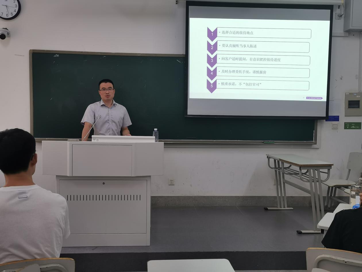 法律诊所探索教学新模式920下午,北京大成(南京)律师事务所徐超等四位专职律师来到法律诊所1班的课堂,给同学们上了一堂生动的接待当事人的课程。观看同学们的模拟接待后律师们从专业律师的角度进行点评。接着律师进行接待当事人的示范展示,让同学们从对比中获得更感性的认知。此外,律师们从能否成案、目的性问题发问、案情判断、情感共鸣、风险规避等方面为同学们讲解了接待当事人需要注意的问题。这节理论与实践相结合的课程,使同学们通过模拟及其讲解,将相关知识掌握更扎实通过专业律师进课堂参与教学的方式,法律诊所实践教学课程将会收到更好的效果