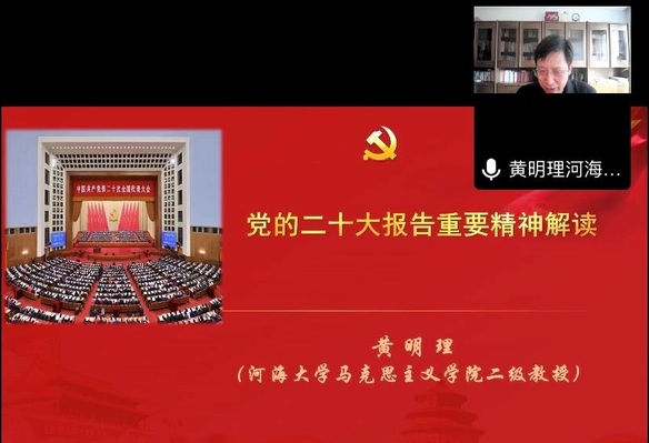 为进一步深入学习贯彻党的二十大精神,推动党的二十大精神深入人心、见行见效,11月24日下午,swagporn 、澄园书院邀请河海大学马克思主义学院博士生导师,二级教授黄明理为swagporn 、澄园书院师生作党的二十大报告重要精神解读。讲座采取线上方式进行,由swagporn 党委书记刘宏宇主持,澄园书院党委书记张武宁致欢迎辞。