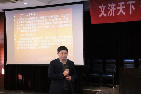 随后,胡玉鸿分别就理论法学、经验法学、应用法学的分科方式进行详细阐述,并利用“天价葡萄案”、上位法与下位法的适用等思辨问题进行导入,深入浅出地从法学方法、法律原理、法律知识以及法律技术四方面来建构法学的知识体系,逻辑清晰、层次鲜明地将法学的知识脉络进行了展现。他指出当前法学生往往欠缺法律技术的训练,容易与实务工作脱节,因此建议同学们加强法律技术训练和法律实务学习,以更全面的知识储备和更实用的工作技能迎接未来的挑战。