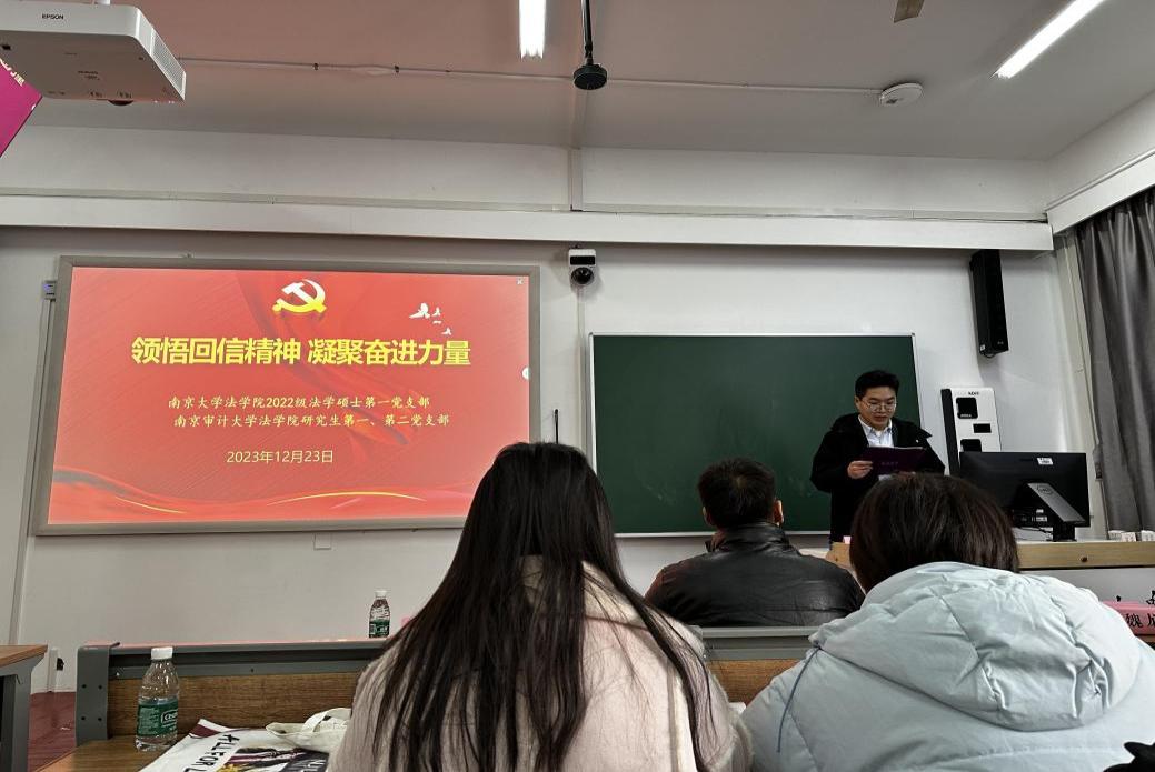 为深入学习习近平总书记给swagporn 审计专业硕士国际班留学生的回信精神和南京大学留学归国青年学者的回信精神,以及习近平总书记在中共中央政治局第十次集体学习上的讲话精神,进一步加强研究生党支部建设,12月23日上午,swagporn 研究生第一、第二党支部部分党员赴南京大学(浦口校区)参观学习,与南京大学2022级法学硕士第一党支部共建,开展“领悟回信精神,凝聚奋进力量”的主题党日活动。