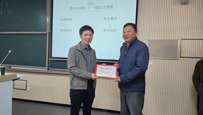 孙展望老师的授课内容是“政权组织形式”。在授课过程中,孙老师对讲授的知识点进行体系化编排,通过“学生课前演讲汇报+教师点评、教师专题推进+学生讨论+老师总结”来组织教学内容,引导学生课前线上预习,课中小组讨论,课后小组研习,全方位以学生为中心,开展线上线下混合教学。整堂授课思路清晰,节奏得当,气氛活跃,内容丰富,学生参与性强,并贯彻了“教书的时候育人;多维多元育人;融育人于教学内容和教学方法改革中”的思政课程理念。
