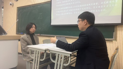 为深化理解,胡晓涛老师设计了一场“当事人咨询”模拟场景。同学们相互讨论,围绕一件“协议离婚”展开角色扮演。初次演绎中,同学们尚且缺乏经验。掌博文与陶怡然律师随即现场示范标准流程:从接待礼仪到事实梳理,从业界术语转化到风险告知,两位律师以专业姿态展现了“倾听—分析—总结”的逻辑闭环。通过对比式教学,同学们直观感受到实务操作的细腻与严谨,更加加深了大家对实务工作中接待当事人问题的理解。